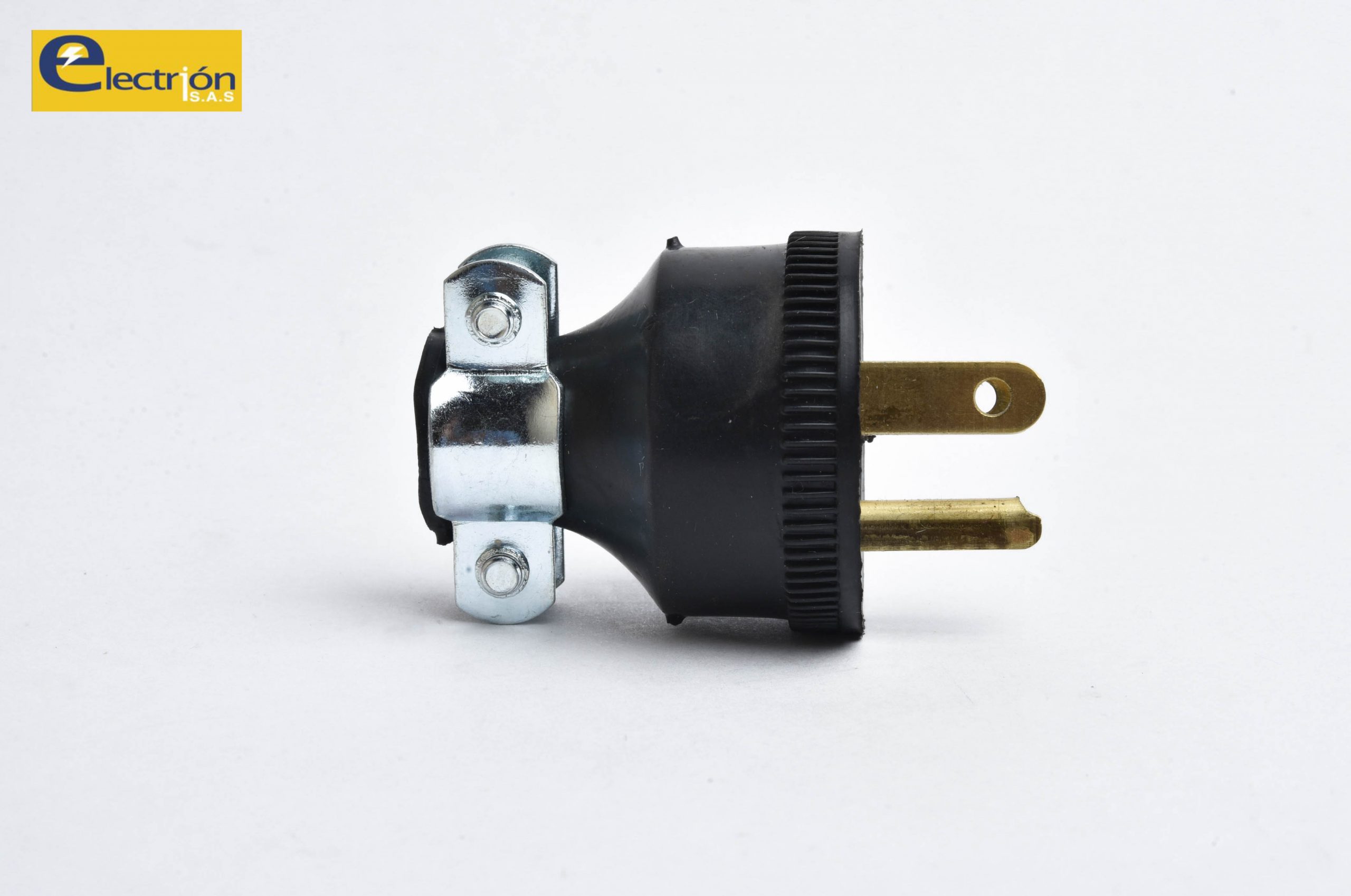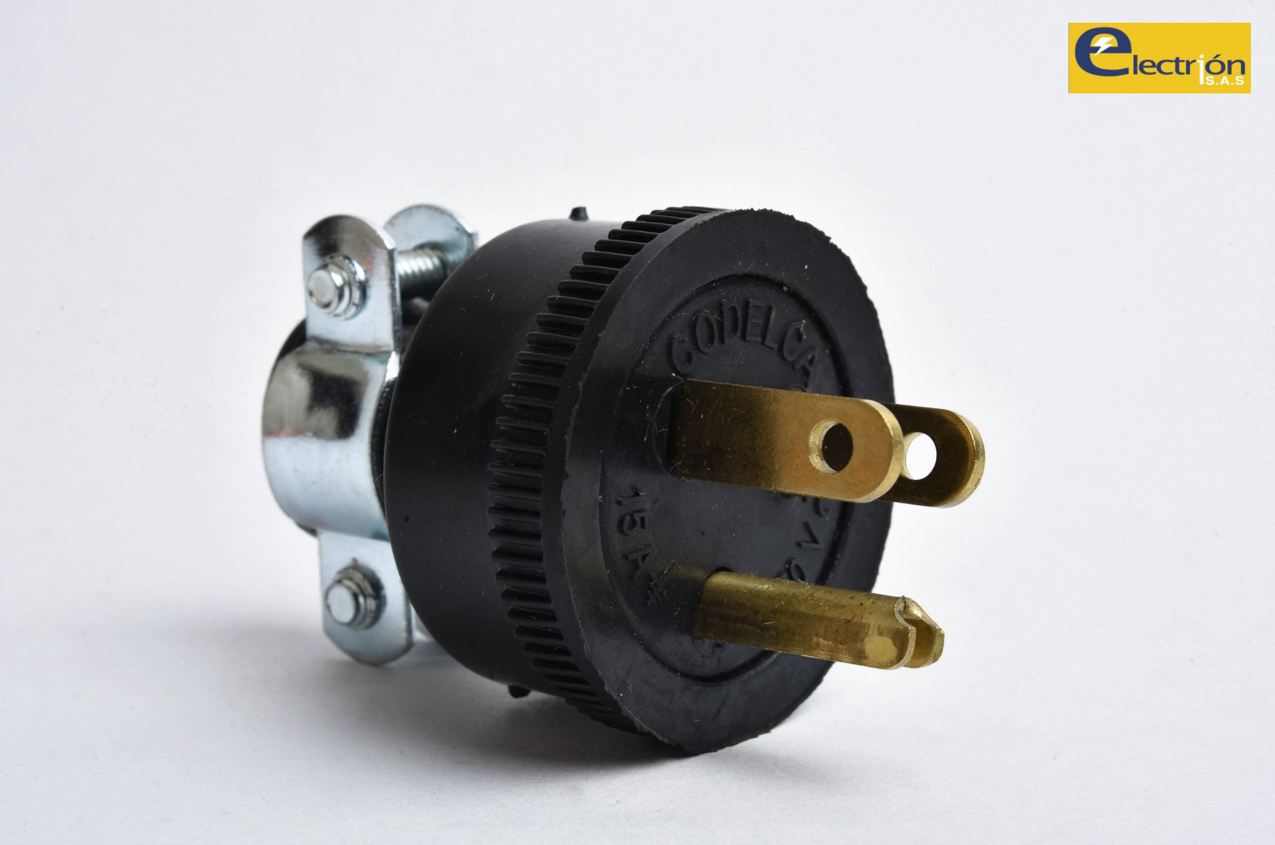 Enchufe de Caucho 15 Amperios Codelca con Polo a Tierra y Sujetador metálico de Cable. Cumple con Normas Eléctricas Colombianas.