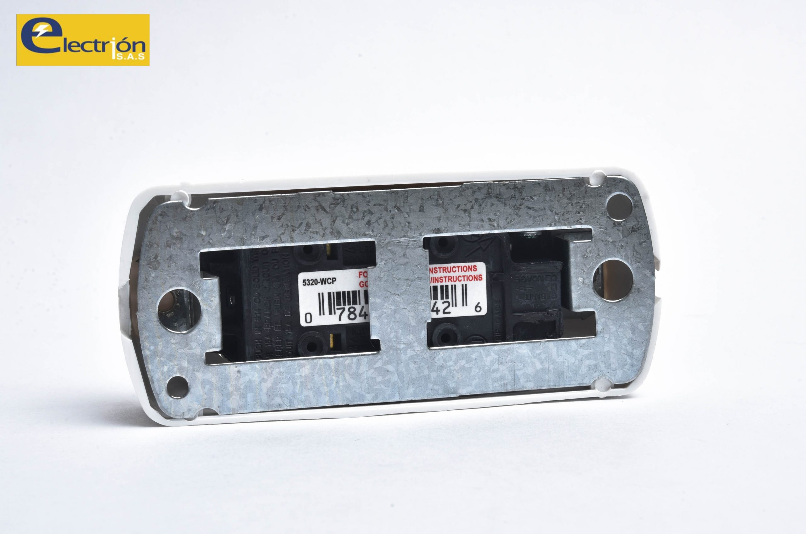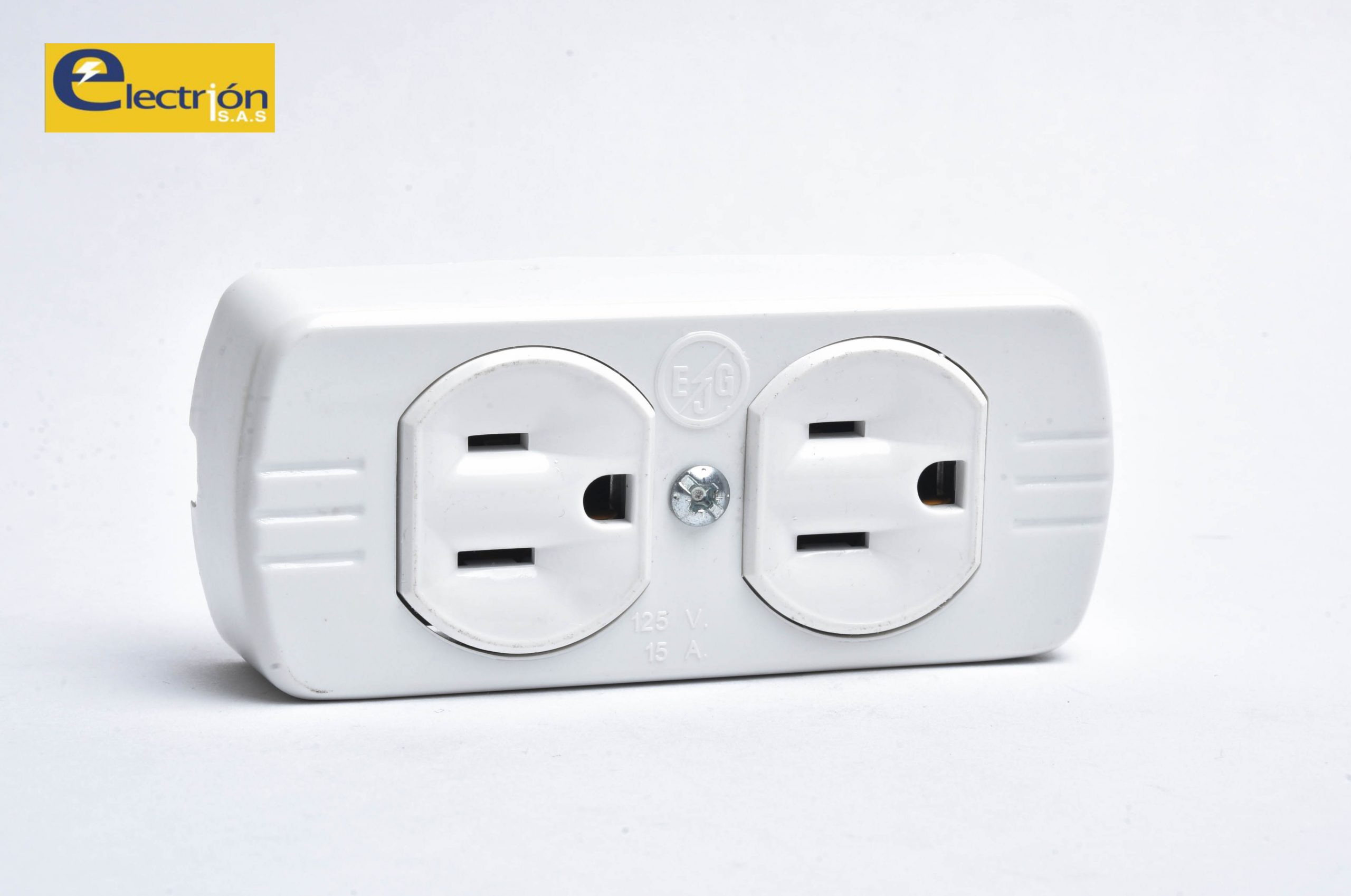 Toma doble de sobreponer con tomas Levitón blanco EJG, fabricado con tomas originales Levitón, garantía de calidad y seguridad en sus espacio.